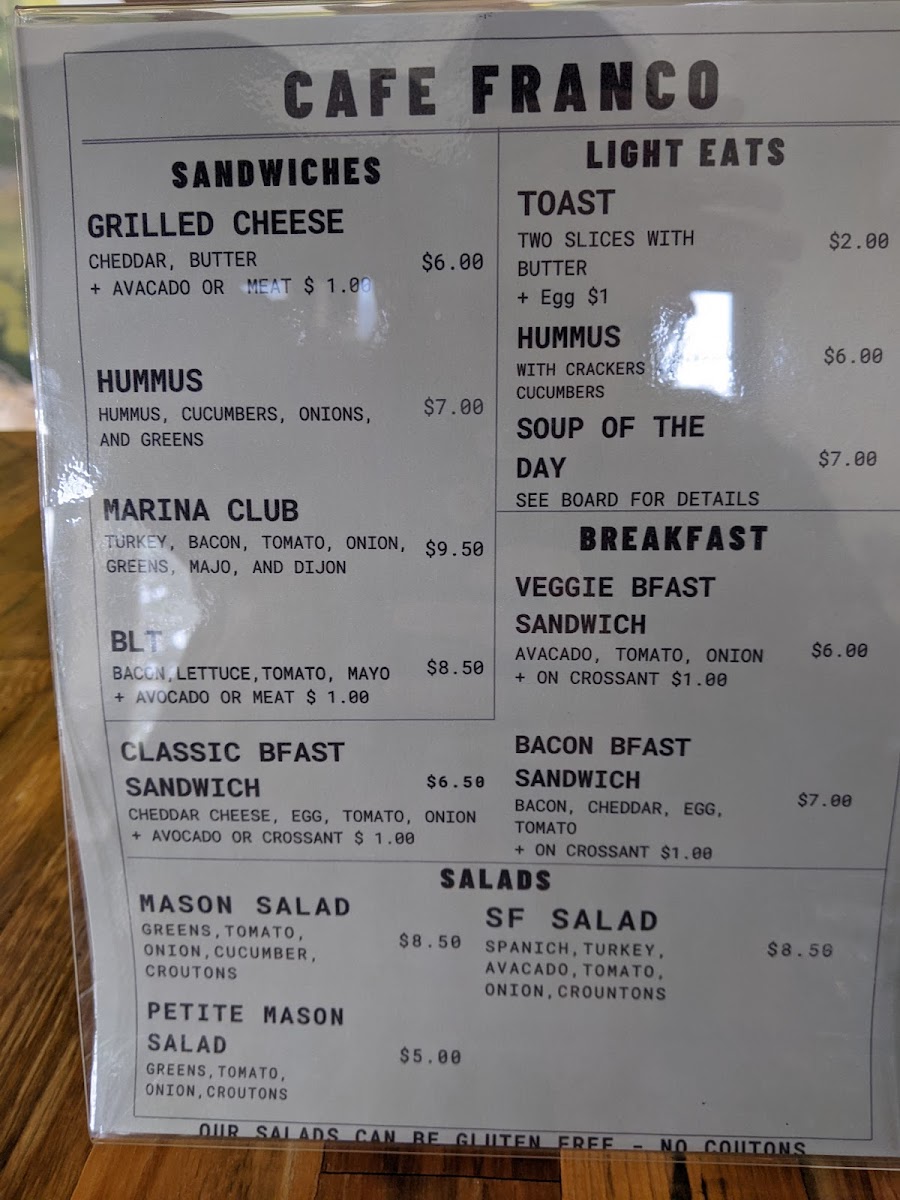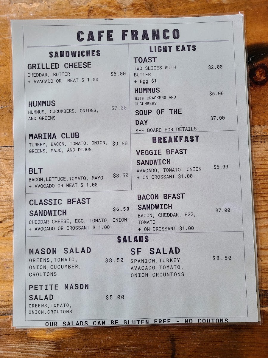 Welcome to Cafe Franco, an inviting cafe located at 240 Funston Rd, San Francisco. The menu is a delightful mix that promises something for everyone, boasting breakfast options like the Veggie Bfast Sandwich and Bacon Bfast Sandwich, perfect for fueling your day. For lunch, explore their scrumptious sandwiches, including the F.t.c Sandwich and The Gobble, all reasonably priced under $11.25.